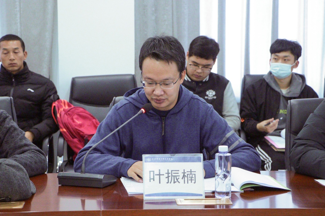 随后,叶振楠副院长进行总结讲话,他首先充分肯定了2021年体委工作取得的成绩。并对2022年体委工作提出希望,一是贯彻落实《关于全面加强和改进新时代学校体育工作的意见》,二是统筹做好疫情防控和体育工作,强化学院体育教学工作,教会学生科学锻炼和健康知识,三是对标对表做好本科教学合格评估,照“以评促建,以评促改,以评促管,评建结合,重在建设”的本科教学工作评估方针提高体育教学质量,四是大力开展第二课堂体育活动,着力保障学生每天体育活动时间,促进学生养成终身锻炼的习惯。五是以服务学院应用型人才培养为目标,鼓励各位老师个人发展与学院发展相融合。