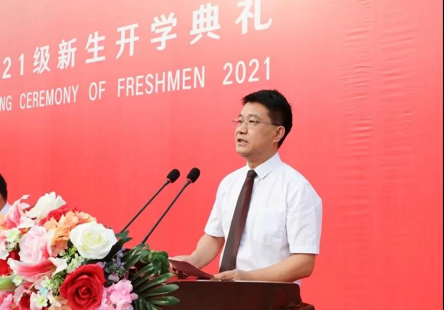 院长王斌在开学典礼上致辞。王院长代表学院全体师生员工向2021级新生表示衷心的祝贺和热烈的欢迎。他寄语新同学们要强志气,立鸿鹄伟志,做有理想、有追求的大学生;要强骨气,炼钢筋铁骨,做有担当、有作为的大学生;要强底气,增学识见闻,做有内涵、有修养的大学生。希望同学们牢记习近平总书记的嘱托,握紧四载春华,高扬理想风帆,坚定信念、锤炼品格、练就本领,以真才实学奋进新征程、建功新时代。