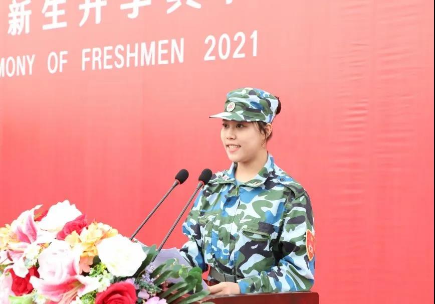 杨婷亦同学代表2021级新生发言,她号召全体新同学要把握大学四年时光,找准“小目标”,做好“大规划”,树立远大的理想信念,勇担时代重任,秉承“明德励学、效实致新”的校训精神,奋斗青春,报效祖国!