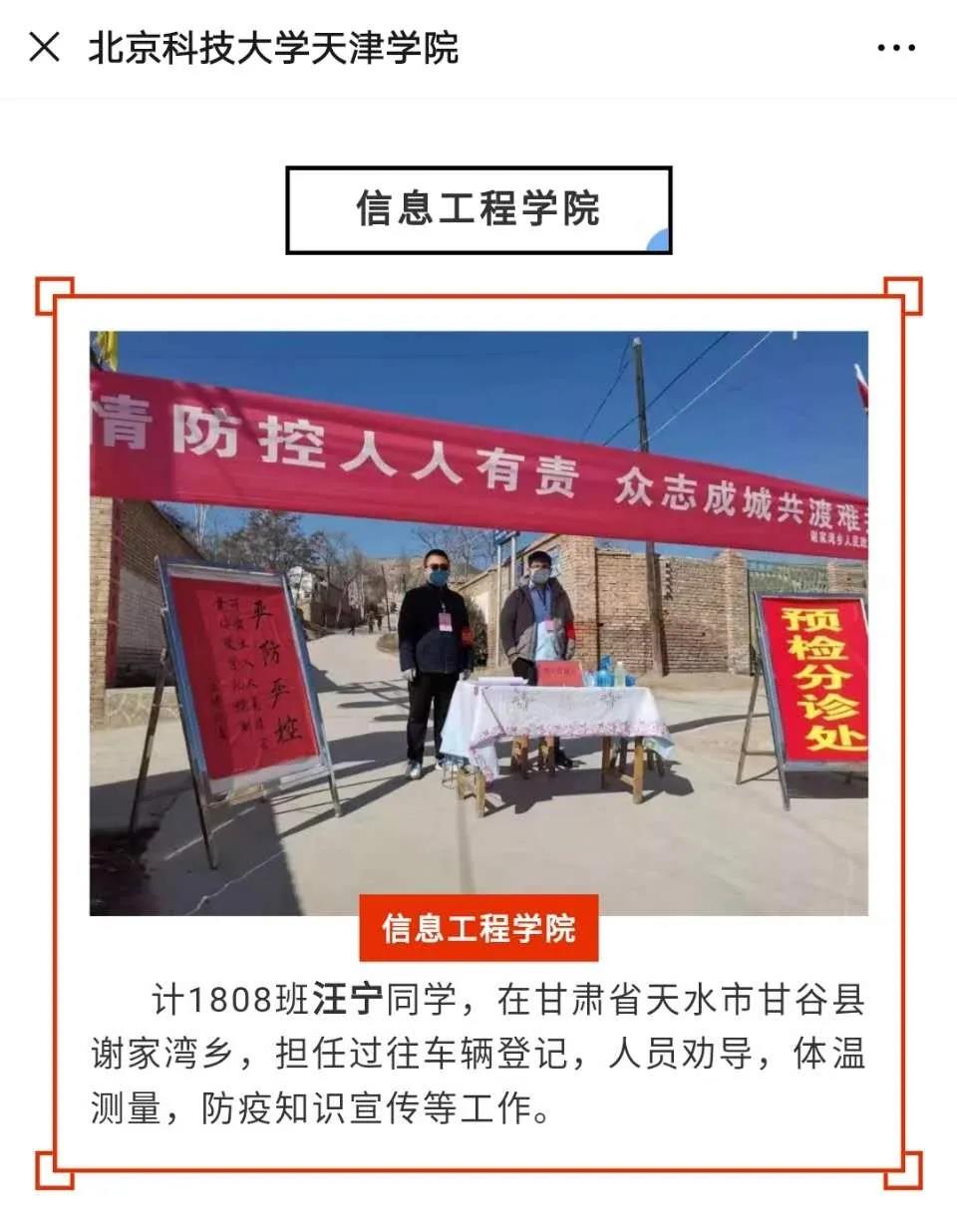 疫情就是命令,防控就是责任。新年伊始,待在家中的汪宁在新闻上了解到全国出现新冠肺炎疫情,他便主动请缨,自告奋勇,写下请战书,按下红手印,立下“无惧奉献,奉献自己”的铿锵誓言,到甘谷县谢家湾乡汪坪村疫情防控领导小组报道,光荣的成为了当地第一名疫情防控返乡大学生志愿者。同时,他在所在村的微信群里发出倡议书,号召本村其他返乡大学生同自己一道加入到家乡联防联控的队伍,为当地疫情防控工作贡献自己的青春力量。倡议发出后,很快就得到了其他大学生的响应,他们积极报名,成立了以汪宁为队长的汪坪村疫情防控青年志愿服务队,同家乡人民一道为疫情防控工作发光发热。
