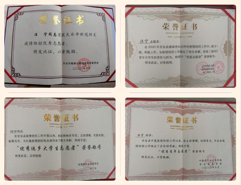 新冠疫情发生后,待在甘谷家中的汪宁,主动请缨,自告奋勇,加入家乡疫情联防联控队伍,志愿服务疫情防控工作,为本地疫情防控工作做出了突出贡献。他的先进事迹获得了共青团中央、甘肃日报、甘肃省学联、天水晚报、天水市人民政府官网、甘谷县人民政府门户网、甘谷县电视台等在内的多家媒体和网站的宣传报道,并获得了天水市精神文明建设指导委员会、共青团甘谷县委和汪坪村党支部颁发的“优秀志愿者”证书。