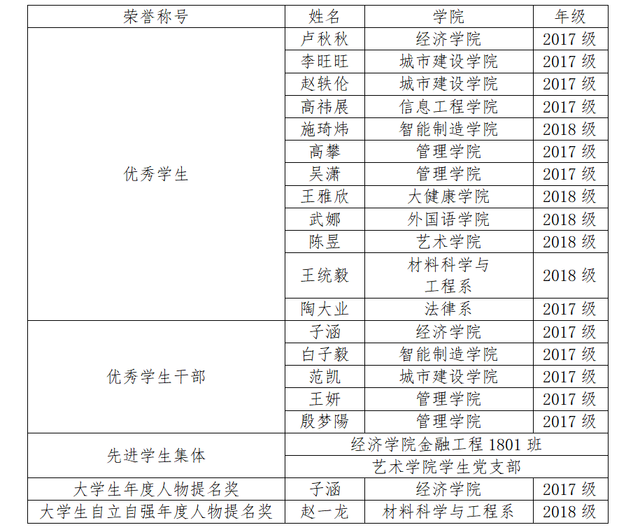 在天津市高等学校2019-2020学年度先进学生集体、先进个人评选中,伟德官网李旺旺等11名同学获评“普通高等学校2019-2020学年度天津市优秀学生”荣誉称号;白子毅等5名同学获评“普通高等学校2019-2020学年度天津市优秀学生干部”荣誉称号;经济学院金融工程1801班和艺术学院学生党支部获评“普通高等学校2019-2020学年度天津市先进学生集体”荣誉称号;国贸1701班子涵同学获评“普通高等学校2019-2020学年度天津市大学生年度人物提名奖”荣誉称号;材料1801班赵一龙同学获评“2020年天津市大学生自强自立年度人物提名奖”荣誉称号。