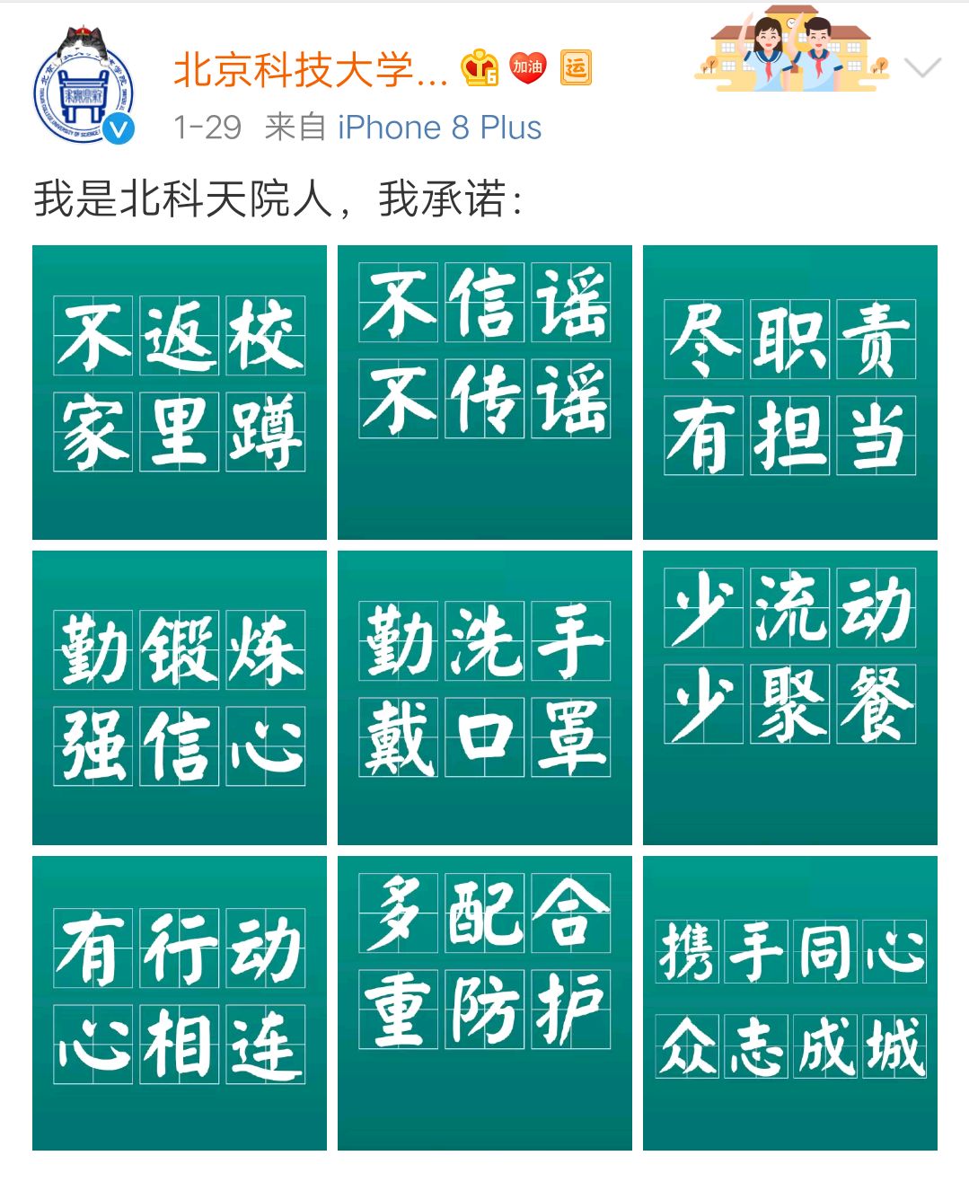 大力开展疫情防控宣传工作,通过官方微信平台、微博、师生微信群、QQ群等网络渠道,及时发布学院通知、公告、防控措施等,向全院师生和家长宣传普及疫情防治知识和防控要求。自1月21日以来,学院官方微信平台和官网微博共发布疫情防控信息60余条,阅读量86000余人次。