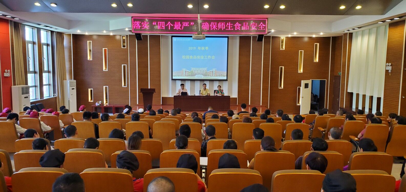 为进一步提高学院食堂从业人员的食品安全责任意识,规范从业人员食品加工操作行为,确保师生饮食安全。学院后勤处以落实 “四个最严”为指导方针,于2019年8月30日召开秋季食品安全工作会议。