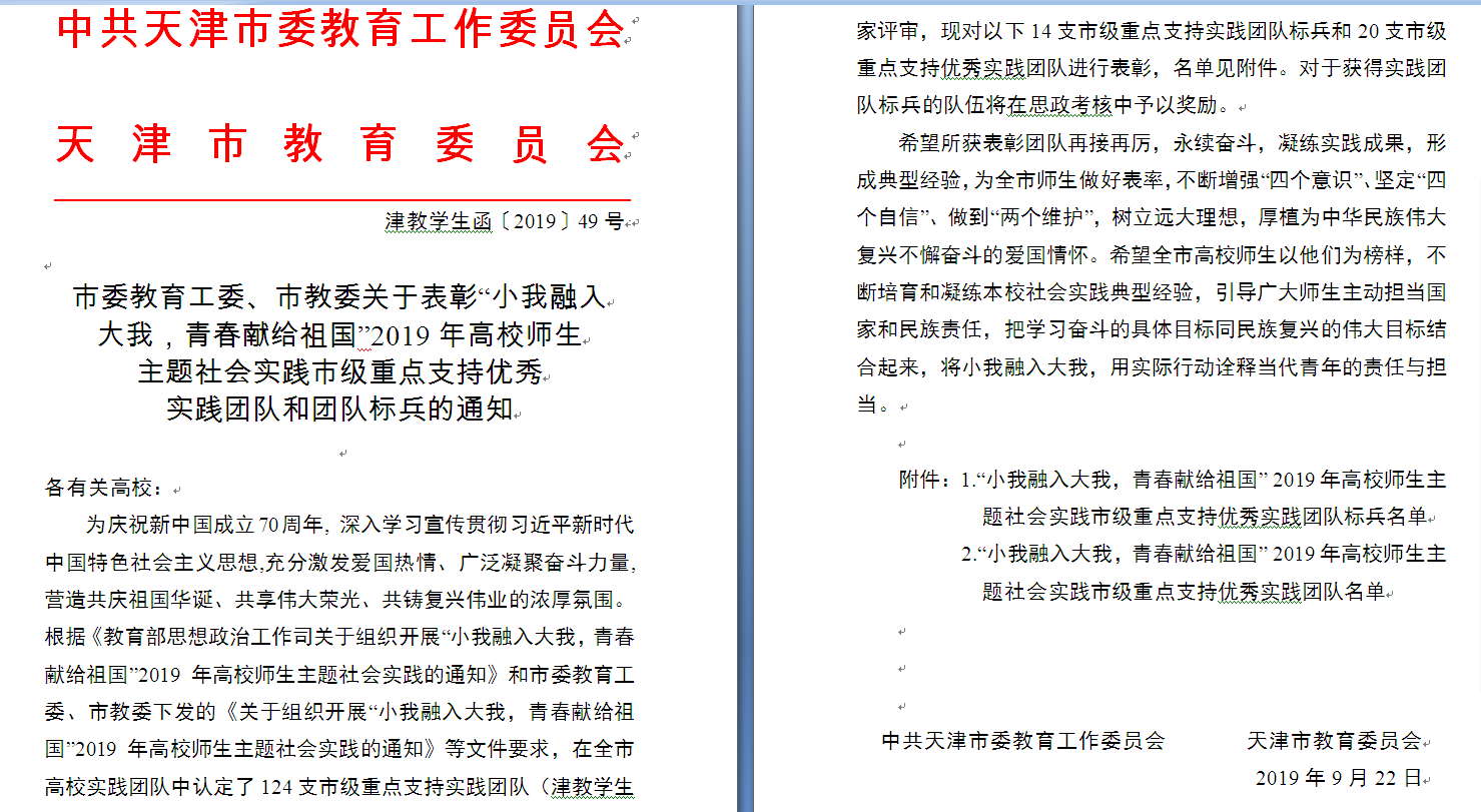 为庆祝新中国成立70周年,深入学习宣传贯彻习近平新时代中国特色社会主义思想,充分激发爱国热情,广泛凝聚奋斗力量,营造共庆祖国华诞、共享伟大荣光、共铸复兴伟业的浓厚氛围,教育部、市教工委及市教委组织开展“小我融入大我,青春献给祖国”2019年高校师生主题社会实践活动,伟德官网青年志愿者协会“红星照耀新青年”社会实践团荣获2019年高校师生主题社会实践市级重点支持优秀实践团队。