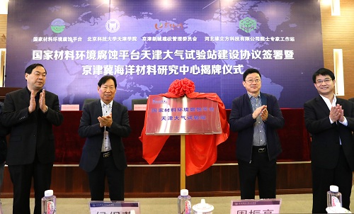 之后,侯保荣院士、何民庆校长、周振亮书记、王斌院长、毕士君董事长共同为京津冀海洋材料研究中心和国家材料环境腐蚀平台天津大气试验站揭牌。