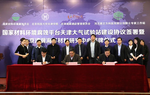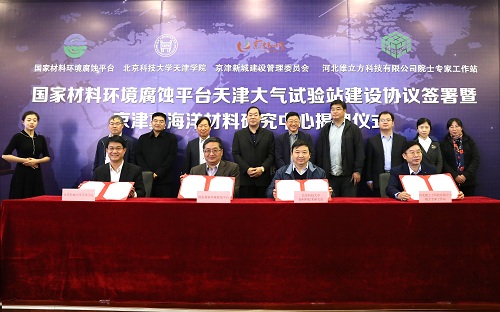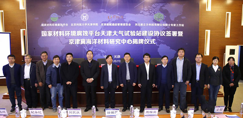 仪式上,国家材料环境腐蚀平台主任李晓刚教授,京津新城管委会周振亮书记,bevitor伟德国际1946官网党委书记、院长王斌共同签署了国家材料环境腐蚀平台天津大气试验站建设协议。